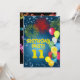 A fun 11th birthday party invitation with happy colours, balloons and fireworks. See the whole range of invitations and cards in my store.
