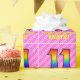 This festive and upbeat 11th birthday themed wrapping paper design features a large number "11" having a colorful rainbow spectrum inspired gradient pattern. It also features the message "Happy 11th Birthday,", followed by a custom name. The background features a dark pink and light pink stripes pattern containing loving pink heart shapes. Wrapping paper like this might be used when wrapping gifts being given to somebody in celebration of their eleventh birthday. [~Z0000415]