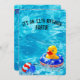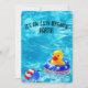 Yellow duck floating with a flag beach ball in a swimming pool for an 11th birthday pool party invite.