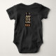 Black baby one-piece bodysuit with the numbers 111,222,333,444,555 in orange from an alarm clock.
