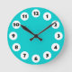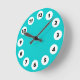 A stylish clock face with the numbers placed inside circular colour spots in each hour position. Also available in other colours.
