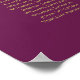 This 12 table wedding seating chart is both simple and elegant. It includes table assignments for 120 guests with 10 seats per table. The design features gold text on a magenta or cassis purple background with a lacy script calligraphy title. The corners are decorated with a frilly faux foil filigree with curls and swirls. Stylish, chic and sophisticated way to help your guests find their seats at your reception.