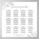 This 12 table wedding seating chart is both simple and elegant. It includes table assignments for 120 guests with 10 seats per table. The design features dark grey and light blue text on a white background with a lacy script calligraphy title. The corners are decorated with a frilly faux foil silver filigree with curls and swirls. Stylish, chic and sophisticated way to help your guests find their seats at your reception.