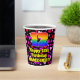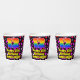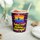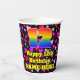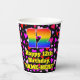 This cheerful and colorful birthday paper cup design features a large number “12” having a rainbow spectrum gradient inspired pattern. It also features the message “Happy 12th Birthday,”, and a personalized name. The background features a pattern of pink, purple, and red heart shapes. Upbeat, joyful paper cups like this might be fun to have at a birthday party/celebration being held to celebrate somebody’s 12th birthday. [~Z0000548]