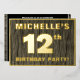 The front of this bold twelfth birthday celebration foil invitation card features a custom name, a large number “12th”, the message “BIRTHDAY PARTY!”, and a border, all in foil. There is a rustic, yet elegant, faux wood grain look inspired pattern for the background of the front. The back features personalized details about the event, such as the date, time, venue/place, and any other important information. Customizable invitations like these might be used to invite attendees to a birthday gathering being held to celebrate somebody’s 12th birthday. [~Z0000598]