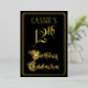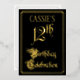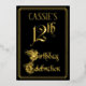 The front of this elegant, fancy, foil twelfth birthday party/celebration invitation design features the message “12th Birthday Celebration” in luxurious script-style text. It also has an editable name. The background of the front is coloured black by default (although it can be customised to a different colour). The back features personalised details about the event, such as the date, time, location, and any other information that may be relevant. Ornate, opulent, customisable invitations like these might be used to invite guests to a birthday party being held in celebration of somebody’s twelfth birthday. [~Z0000589]