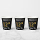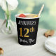 This luxurious and ornate birthday themed paper cup design features a custom name and the message “12th Birthday Party”. The large number “12th” has an imitation/faux gold-inspired colouring pattern, and the words “Birthday Party” are in fancy script-style text. The background is coloured black by default (although it can be customised). Elegant, fancy paper cups like this might be used at a birthday celebration/party being held to honour somebody’s twelfth birthday. [~Z0000567]
