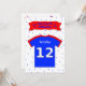 On the front of this fun party invitation there is a large red birthday banner with the message "Come to my 12th birthday party". The red and blue sports-style shirt, with a large white number 12 on it, is ready for you to personalise with a name. On the reverse of the card there are plenty of lines for details of the party. This is a colourful design, ideal for both boys and girls.