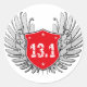 There are 13.1 miles in a half-marathon. Celebrate your run with a grungy red shield with white angel wings and 13.1 on it. Great gift for a half marathon runner.