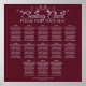 This seating chart shows wedding reception seating assignments for 130 guests at 13 tables. The design is simple, elegant and sophisticated with script lettering, gray text, a vintage floral filigree in a silver faux foil color, and a burgundy or wine red background.