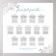 This beautiful 13 table wedding seating chart includes table assignments for 130 guests with 10 seats per table. The design features dark grey and teal or turquoise text on a white background with a lacy script calligraphy title. The corners are decorated with a frilly faux foil silver filigree with curls and swirls making it both simple and elegant. Stylish, chic and sophisticated way to help your guests find their seats at your reception.