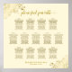 This beautiful 13 table wedding seating chart includes table assignments for 130 guests with 10 seats per table. The design features gold text on a cream or ivory colored background with a lacy script calligraphy title. The corners are decorated with a frilly faux foil filigree with curls and swirls making it both simple and elegant. Stylish, chic and sophisticated way to help your guests find their seats at your reception.