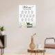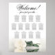 This elegant wedding seating chart has 13 tables and showcases a romantic and sophisticated design featuring a single long-stemmed ivory, white, or cream coloured rose lying on its side and reflecting in a pool of water. With seating arrangements for 130 guests and 10 seats per table, this chart provides ample space for your guests to locate their seats with ease. The title, "Welcome! please find your table," is written in elegant script calligraphy, while there is space available for the names of the couple and the wedding date at the bottom. This chart is an excellent way to add beauty, class, and style to your wedding reception, while also assisting guests in finding their seats.