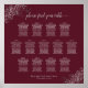This beautiful 13 table wedding seating chart includes table assignments for 130 guests with 10 seats per table. The design features pale gray text on a burgundy or maroon background with a lacy script calligraphy title. The corners are decorated with a frilly silver faux foil filigree with curls and swirls making it both simple and elegant. Stylish, chic and sophisticated way to help your guests find their seats at your reception.