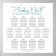 Make your wedding reception beautiful with this seating chart. It features a simple yet elegant design with a fancy teal or turquoise script title & grey text on a white background with a silver faux foil floral border. This chart shows table assignments for 130 people with 10 seats per table so your guests will have an easy time finding the right table.