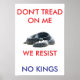 Display your resistance with this photo of a coiled rattlesnake poised to resist tyranny. "Don't Tread On Me" was the historic American slogan in the fight for liberty during the Revolutionary War. Red letters on a white background. Blue letters spelling out NO KINGS.