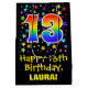This colourful, vibrant, and exciting birthday-themed giftbag design features a large number "13" with a rainbow spectrum gradient style pattern, along with the message "Happy 13th Birthday,", and an editable recipient name. It also has a colourful background pattern featuring variously-sized star shapes. A gift bag like this might be a fun way of wrapping a birthday present or gift being given to somebody who is celebrating their 13th birthday. [~Z0000510]