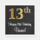 This stylish, elegant, and sophisticated birthday-themed paper napkin design features a large ordinal number “13th” having a faux/imitation gold-inspired gradient pattern, along with the birthday greeting message “Happy 13th Birthday,” and a custom name in a script-style font. It also has a black-coloured background. Luxurious birthday themed paper napkins like this might be used at a birthday party in celebration of somebody’s 13th birthday. [~Z0000516]