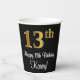 This elegant, luxurious, and stylish birthday-themed paper cup design features a large ordinal number “13th” having an imitation/faux gold-inspired appearance, plus the birthday greeting message “Happy 13th Birthday,” and a customisable name in a script-style font. It also has a black-coloured background. Birthday themed paper cups like this might be a fun way to celebrate somebody’s thirteenth birthday. [~Z0000538]