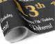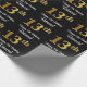 This sophisticated, elegant, and stylish birthday wrapping paper design features a large ordinal number “13th” having an imitation/faux gold-like look, along with the birthday greeting message “Happy 13th Birthday,” and a customisable recipient name in a script-style font. The background is coloured black. Birthday themed wrapping paper like this might be used when giving a gift or present in celebration of somebody’s 13th birthday. [~Z0000515]
