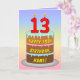 This upbeat and fun birthday greeting card design features a cartoon-style depiction of a three-tier birthday cake having number-shaped candles on top showing the age “13“, along with the message “HAPPY 13TH BIRTHDAY,”, and a personalised recipient name. The background of the front features a multi-colour pastel rainbow spectrum inspired gradient pattern. The inside has a customisable birthday greeting message, or could perhaps be cleared and left blank if a message is to be written by hand instead. A colourful, personalised birthday greeting card like this might be a fun way to deliver a birthday greeting message to somebody who is celebrating their thirteenth birthday. [~Z0000625]