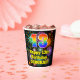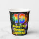 This fun and cheerful birthday paper cup design features a large number “13” with a rainbow spectrum gradient inspired pattern, along with the message “Happy 13th Birthday,”, and a personalised name. The background features a vibrant and colourful pattern inspired by the look of bursting celebratory fireworks. Vibrant, colourful paper cups like this might be fun to have at a birthday celebration being held in celebration of somebody’s 13th birthday. [~Z0000539]