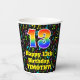 This exciting and cheerful music themed birthday paper cup design features a large number “13” with a rainbow spectrum gradient inspired pattern, along with the message “Happy 13th Birthday,”, and a personalised name. The background features a multicolored pattern having music notes and symbols of various sizes and colours. Vibrant, colourful paper cups like this might be fun to use at a birthday celebration/party being held to celebrate somebody’s 13th birthday. [~Z0000541]
