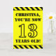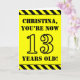 The front of this fun and attention-grabbing birthday themed greeting card design features an editable name and the message "YOU’RE NOW 13 YEARS OLD!" in black stencil style text on a yellow colored background. There is also an eye-catching black and yellow stripes pattern at the top and bottom edges of the front. The inside features a customized birthday greeting message, or could perhaps be cleared and left blank if a message is to be written by hand instead. A customizable birthday card like this might be a fun way to send birthday wishes to somebody who is celebrating their thirteenth birthday. [~Z0000413]