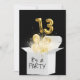 Gold balloons with sparkles and ribbons in a white box on black background for 13th birthday party.