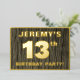 The front of this bold thirteenth birthday party foil invitation card features a customisable name, a large number “13th”, the message “BIRTHDAY PARTY!”, and a border, all in foil. There is a rustic, yet elegant, faux wood grain look inspired pattern for the background of the front. The back features personalised details about the event, such as the date, time, location/venue, and any other information that may be important. Personalised invitations like these might be used to invite attendees to a birthday gathering being held to honour somebody’s 13th birthday. [~Z0000598]