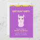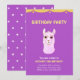 13th Birthday party invitation card. The Birthday card has a cute pink llama on ultra violet background. There is a star pattern on the back side. Text is ready to be personalised. Word llama means several things.