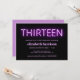 Cool modern 13th birthday party invitation with "thirteen" in purple glowing neon lights against a black background.