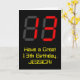 The front of this geeky and fun birthday themed greeting card design features a large number "13" having a red seven segment digital display inspired appearance, along with the message "Have a Great 13th Birthday," and a customisable name, on a black coloured background. The inside features a customised birthday greeting message, or could perhaps be cleared and left blank if a message is to be written by hand instead. A customisable birthday card like this might be a fun way to acknowledge somebody’s thirteenth birthday. [~Z0000386]