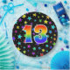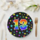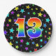 This fun, colourful, and cheerful paper plate design features a large number "13" having a rainbow spectrum gradient inspired pattern colouring. The background features a pattern of colourful star shapes. Fun paper plates like this might be used at a celebration being held in honour of somebody’s thirteenth birthday, or a couple’s thirteenth anniversary, or some other thirteenth event. [~Z0000493]