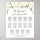 This beautiful 14 table boho chic wedding seating chart features a floral watercolor design with roses, blossoms, and flowers in shades of ivory, white, and cream, along with sage green eucalyptus leaves and garden foliage. The title reads "Welcome! please find your table" written in elegant script calligraphy. There is space for the names of the couple and wedding date. This chart has table assignments for 140 guests with 10 seats per table.