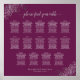 This beautiful wedding seating chart includes table assignments for 140 guests at 14 tables. The simple yet elegant design features light gray text on a magenta plum or cassis purple background with a lacy script calligraphy title. The corners are decorated with a silver frilly faux foil filigree with curls and swirls. Stylish, chic and sophisticated way to help your guests find their seats at your reception.