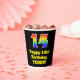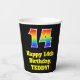 This colourful and exciting birthday themed paper cup design features a large number “14” having a rainbow spectrum gradient inspired pattern. It also features the message “Happy 14th Birthday,”, and a personalised name. The background is coloured black. Colourful, vibrant paper cups like this might be fun to use at a birthday celebration being held to celebrate somebody’s 14th birthday. [~Z0000537]