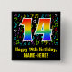 This fun, vibrant, and colourful birthday-themed button design features a large number "14" with a rainbow spectrum gradient inspired pattern, along with the message "Happy 14th Birthday,", and a customisable name. Part of the background has a colourful music notes and symbols pattern. Fun, personalised birthday-themed buttons like this might be worn by the guests at a birthday celebration being held to celebrate a musician’s, a song composer’s, a singer’s, or somebody else’s fourteenth birthday. [~Z0000424]