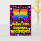 The front of this cheerful and fun birthday themed greeting card design features a large number “14” with a rainbow spectrum gradient inspired pattern, along with the message “Happy 14th Birthday,”, and a personalised name. The background of the front features a pattern of red, pink, and purple heart shapes. The inside has a customised birthday greeting message, or could perhaps be cleared and left blank if a message is to be written by hand instead. An upbeat, customised birthday greeting card like this might be used to acknowledge somebody’s fourteenth birthday. [~Z0000551]