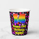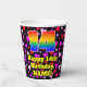 This fun and colorful birthday-themed paper cup design features a large number “14” having a rainbow spectrum gradient inspired pattern. It also features the message “Happy 14th Birthday,”, and a custom name. The background features a pattern of heart shapes with colors like purple, red, and pink. Upbeat, happy paper cups like this might be fun to have at a birthday celebration/party being held to celebrate somebody’s 14th birthday. [~Z0000548]