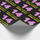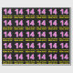 This fun and joyful birthday themed wrapping paper design features a large number "14" having a stripes pattern containing heart shapes coloured light pink and dark pink. It also features the birthday greeting message "Happy 14th Birthday,", and a personalised recipient name. Birthday themed wrapping paper like this might be used when giving a gift or present in celebration of somebody’s fourteenth birthday. [~Z0000435]