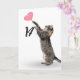 Grey tabby cat with pink heart balloon for 14th birthday on white background.