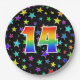 This cheerful, fun, and colourful paper plate design features a large number "14" coloured with a rainbow spectrum gradient inspired pattern. The background features a pattern of colourful star shapes. Fun paper plates like this might be used at a celebration being held to observe somebody’s fourteenth birthday, or a couple’s 14th anniversary, or some other 14th event. [~Z0000493]