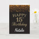 15th Birthday Black and Gold Glitter Card with personalized name. For further customization, please click the "Customize it" button and use our design tool to modify this template.