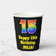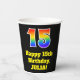 This colourful and exciting birthday paper cup design features a large number “15” with a rainbow spectrum gradient inspired pattern, along with the message “Happy 15th Birthday,”, and a custom name. It also has a black-coloured background. Vibrant, colourful paper cups like this might be fun to have at a birthday celebration/party being held to honour somebody’s fifteenth birthday. [~Z0000537]