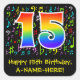 This fun, colourful, and vibrant birthday sticker design features a large number "15" with a rainbow spectrum gradient inspired pattern, along with the message "Happy 15th Birthday,", and a customisable name. Part of the background has a pattern of various music notes and symbols having a variety of colours and sizes. Fun, personalised birthday stickers like this might be used as a birthday party decoration, or perhaps given as a birthday present, or perhaps be used when wrapping birthday gifts being given to celebrate a singer’s, a song composer’s, a musician’s, or somebody else’s fifteenth birthday. [~Z0000423]