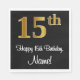 This sophisticated, stylish, and luxurious birthday-themed paper napkin design features a large ordinal number “15th” having a faux/imitation gold-like appearance, along with the birthday greeting message “Happy 15th Birthday,” and an editable name in a script-style font. The background is coloured black. Stylish paper napkins like this might be fun to use at a birthday party being held for somebody who is celebrating their 15th birthday. [~Z0000516]