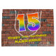 This colourful and vibrant birthday themed giftbag design, inspired by graffiti and street art, features a large number "15" having a rainbow spectrum gradient inspired pattern. It also features the message "Happy 15th Birthday,", and a customisable name. The background features a brick wall style pattern. A fun gift bag like this might be used when giving a gift or present in honour of somebody’s 15th birthday. [~Z0000522]