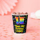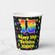 This cheerful and fun birthday themed paper cup design features a large number “15” having a rainbow spectrum gradient inspired pattern. It also features the message “Happy 15th Birthday,”, and an editable name. The background features a multicolored pattern featuring many star shapes with different colours and sizes. Colourful, vibrant paper cups like this might be fun to have at a birthday party/celebration being held to honour somebody’s 15th birthday. [~Z0000540]