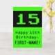 The front of this geeky and nerdy birthday greeting card design features a large green vintage computer gaming style number "15". It also features the birthday greeting message "Happy 15th Birthday,", and a name that can be edited. The inside features a custom birthday greeting message, or could perhaps be cleared and left blank if a message is to be written by hand instead. A silly custom birthday card like this might be a fun way to send birthday wishes to somebody who is celebrating their fifteenth birthday. [~Z0000430]
